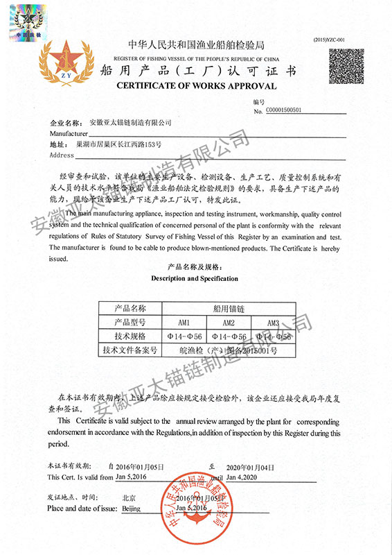 安徽亞太錨鏈制造有限公司是國家高新技術(shù)企業(yè),也是國家GB/T 549-2017《電焊錨鏈》標(biāo)準(zhǔn)的起草和制定單位之一。公司旗下設(shè)有錨鏈分廠、浮標(biāo)分廠、舾裝件分廠等多個(gè)分廠。公司專業(yè)從事φ12.5mm-φ107mm二、三級船用錨鏈、浮標(biāo)錨鏈、錨鏈附件,錨、船舶曬裝產(chǎn)品、航標(biāo)、系船浮、船型標(biāo)、多種規(guī)格海洋監(jiān)測浮標(biāo)及航標(biāo)燈等產(chǎn)品的生產(chǎn)、安裝和服務(wù)。目前公司的產(chǎn)品銷往全國各地船廠、碼頭、航標(biāo)處、航道局、海洋局,并已走上國際市場,如東南亞、中東、歐美等國家。
